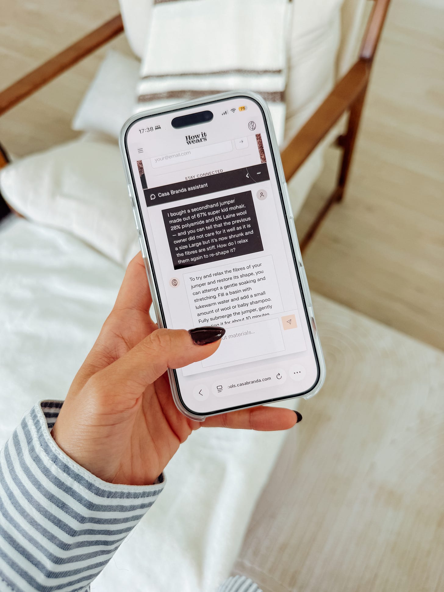 So I asked the Casa Branda assistant. It walked me through what to do: soak it in lukewarm water with a gentle cleanser like baby shampoo, let the fibres relax. Then, the part I didn’t know: you can use a conditioner with natural ingredients to soften them further. The same way you’d treat your own hair.